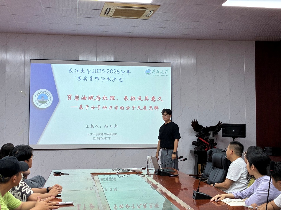赵日新老师以《页岩油赋存机理、表征及其意义——基于分子动力学的分子尺度见解》为主题,为与会师生带来了关于页岩油微观赋存机理研究的新视角。页岩油在微纳米孔喉中的可动性,是制约我国陆相页岩油勘探开发成效的核心瓶颈。准确揭示页岩油的赋存特征、影响因素及其微观机理,对于有效评估可采资源量、精准预测“甜点”分布至关重要,但这已成为领域内公认的技术难题。针对现有技术方法难以从微观层面揭示赋存机理的局限,赵日新老师系统阐述了分子动力学模拟技术在解决该问题上的独特优势。并分享了当前研究在影响因素系统性分析、地层温压环境模拟等方面的不足,提出了一套更具理论支撑的页岩油赋存状态定量评价新思路,旨在突破分子模拟方法的应用瓶颈,为页岩油的高效开发提供更为精准的理论指导。