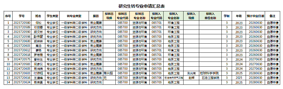 根据《公司研究生学籍管理办法》(长大校发〔2020〕92号)、《关于<公司研究生学籍管理办法>转专业有关条款的补充解释》(研院发〔2024〕5 号)等文件中关于转专业的相关规定,按照工作进程,经员工申请,导师同意,公司审核,现将2025-2026学年第一学期转专业审核结果公示如下,公示时间:2025年9月19日至2025年9月23日。如有异议,请与教学办联系02769111182曾老师。 资源与环境公司 2025.9.19