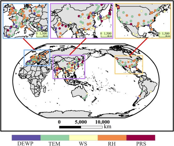 图2 全球261个城市主导气象要素的空间分布