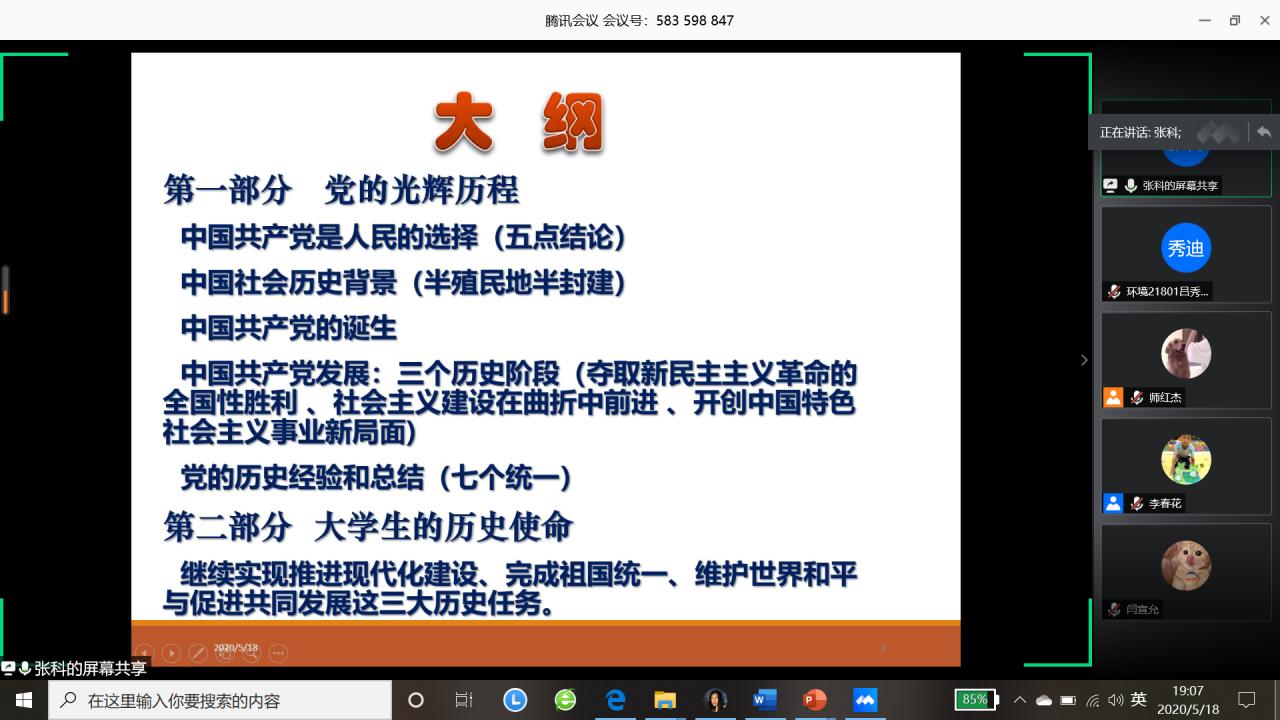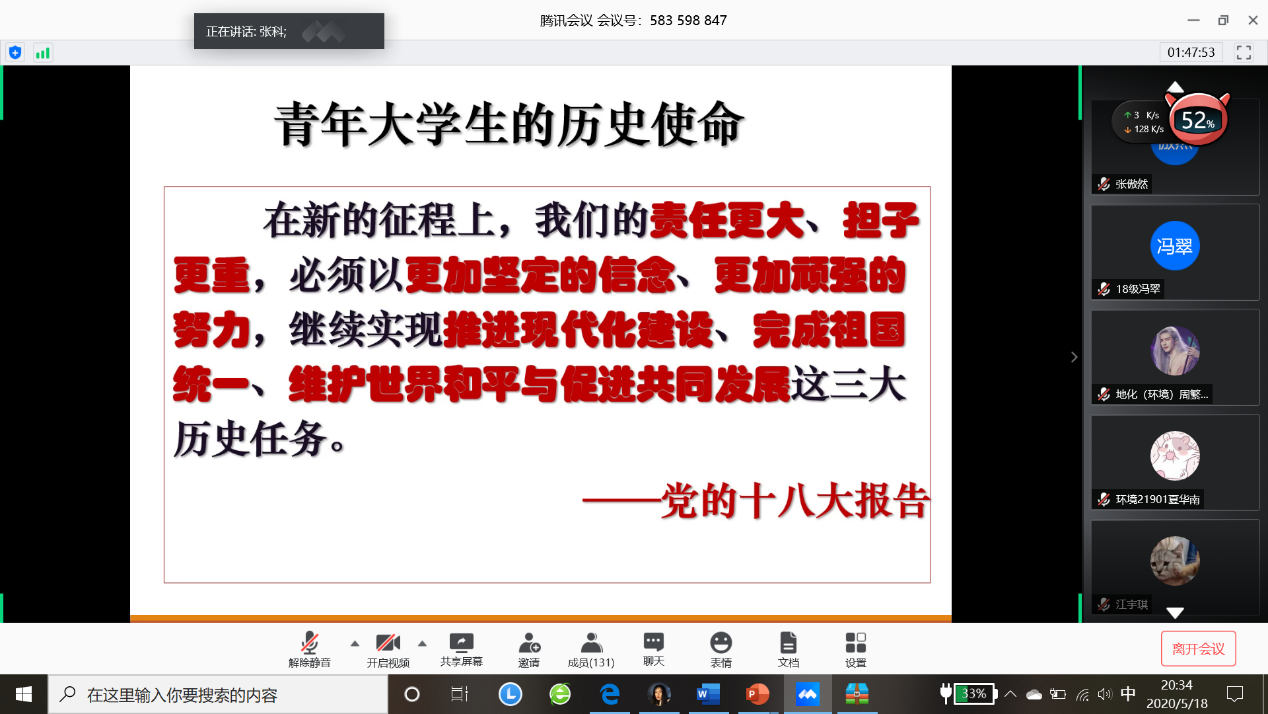 (图/文:吕秀迪)为进一步做好公司党员发展工作,加强对发展对象和入党积极分子的教育和培养,引导其提高思想觉悟,保证发展新党员的质量。best365英国体育在线于2020年5月18日晚19:00以线上腾讯会议的形式举行了2020年上半年入党积极分子和党员发展对象培训会议。公司党委书记张科主讲,党委副书记范梅英参加、本科员工工作党支部书记李春花主持,共130余名入党积极分子和党员发展对象线上学习。