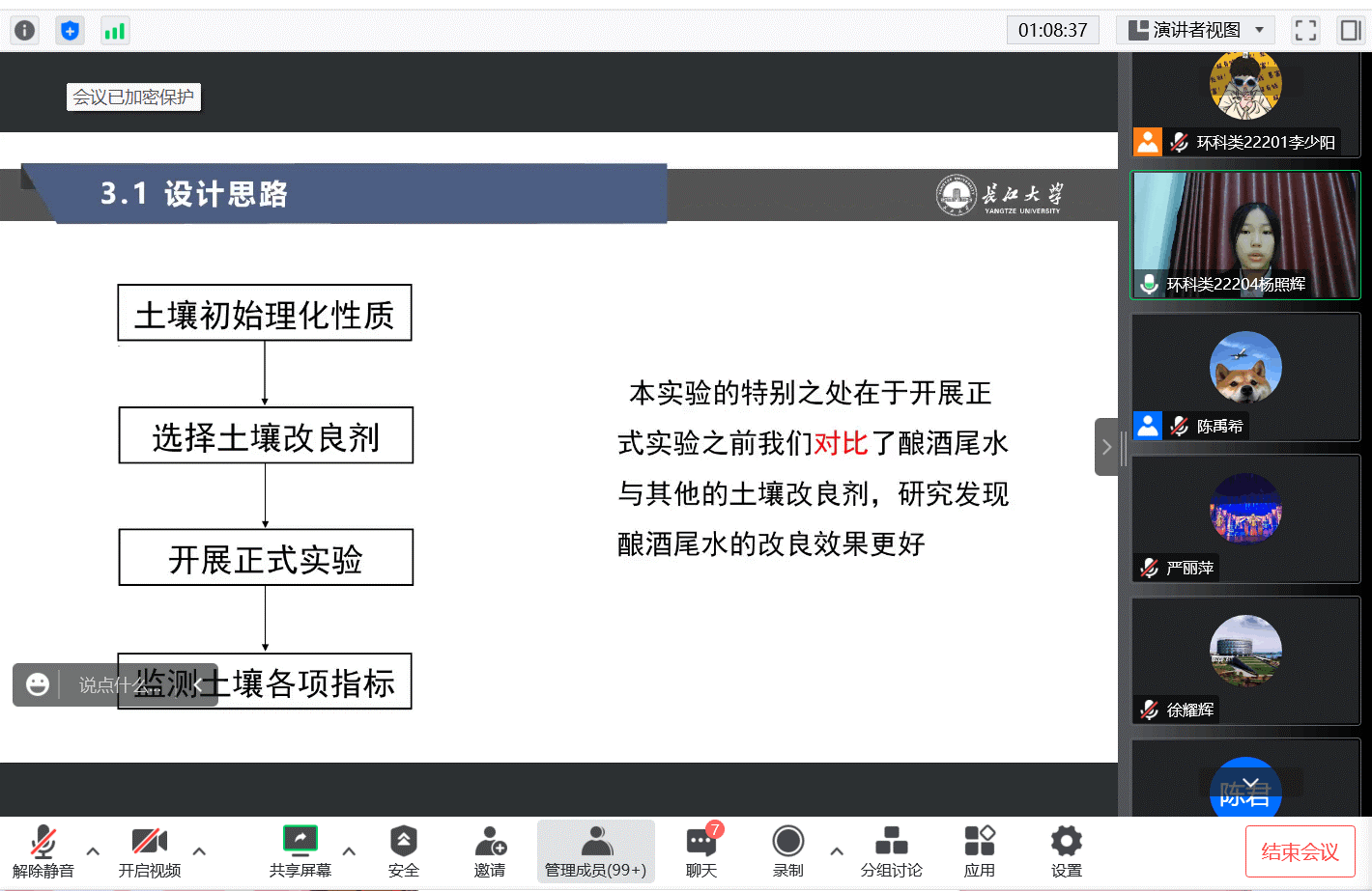 参赛小组的成果包含了自然科学类论文、科技发明制作两大类,紧紧结合同学们所学知识,从水文、环境、地球化学三个层面进行科研与创新,且都颇有成就,展现了当代老员工极高的科研热情和科研素养。张雅璇小组的“鄂尔多斯石炭系煤岩储层微观精细表征研究”让人眼前一亮。张灿灿小组的“酿酒尾水对盐碱土改良效果研究”也让大家十分感兴趣。与此同时,其他小组的答辩也让同学们收获颇多。本次大赛无疑激发了公司同学们极高的创业热情。