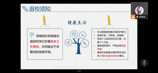 首先,宿建部部长左利通过PPT的方式以返校的流程、返校须知、路途安全等内容开展,向各楼层长及寝室长讲述了返校的具体要求,返校后需督促同学们开展宿舍卫生整理,积极关心同学们的在校安全和心理健康情况,提醒同学们高效复习积极备考开学后的考试等。接着李春花老师就违规电器、宿舍卫生、在外留宿、饲养宠物及宿舍同学相互之间人文关怀等内容,向各位楼层长及寝室长讲述了宿舍消防安全管理的重要性、密切关注同学心理状态及在校安全情况的必要性、宿舍卫生对同学们日常生活的影响、寝室长要留意在外留宿和晚归的同学并及时上报、以及寝室禁止饲养宠物等。