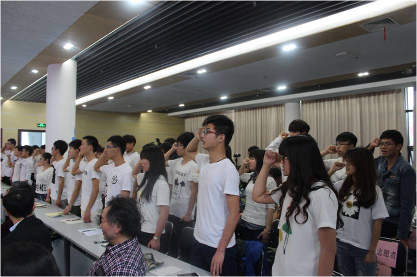 副董事长郭海敏致辞,对国家环境保护部生态司处长、中法武汉生态示范城管委会副主任王捷的光临表示欢迎。紧接着,best365英国体育在线常青生态志愿者协会举行了简单的启动仪式。蔡甸区湖泊管理办公室喻志勇主任对蔡甸区湖泊整体规划做了简单陈述,倡议师生们利用媒介宣传“水环境保护”,加入志愿队伍,促进开展针对“水污染”的调查、治理与研究活动。常青生态志愿者代表梁宇涵上台表达了自己对环境保护的决心与信念。王捷处长为常青志愿者代表授旗。协会全体志愿者进行了宣誓。