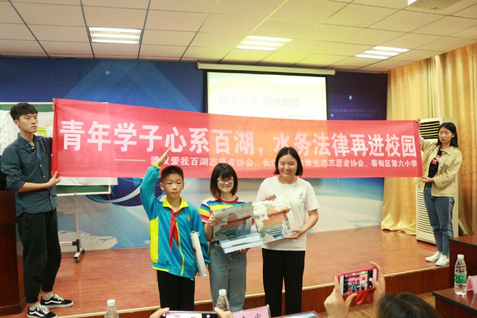 活动伊始,武汉爱我百湖志愿者协会副秘书长张淑倩为公司和蔡甸区第六小学赠送了《武汉湖泊志》、《水法规汇编》,随后进行了市属湖泊、水生植物的科普和趣味问答,帮助同学们强化保护湖泊的相关知识。