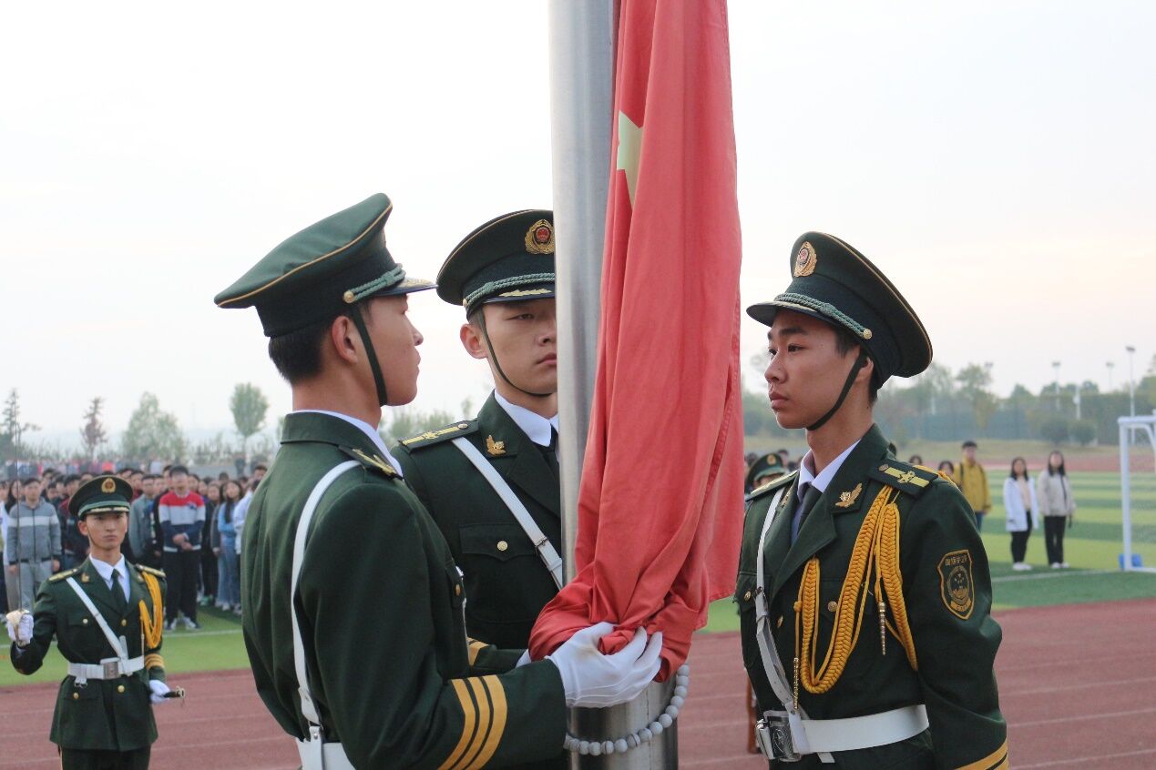 大会分为三个阶段。第一阶段升旗仪式,由best365英国体育在线国旗护卫队的队员护卫国旗,英姿飒爽,昂首挺胸地将国旗护送至升旗台。伴随激昂的《义勇军进行曲》,同学们将目光聚集在鲜艳的五星红旗,冉冉升起的红旗代表了祖国大地和资环学员从晨雾中破晓而出、朝气蓬勃的模样。