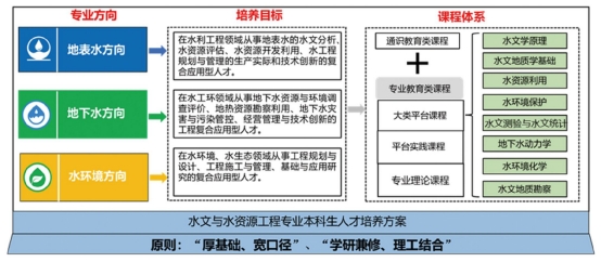 面向国家重大发展战略需求,遵循公司产品发展规律,统筹基础知识和课外时间,开设了地表水、地下水和水环境三个专业方向,形成了通识教育类课程和专业教育类课程相结合的课程体系,遵循“厚基础、宽口径”和“研学兼修、理工结合”的培养原则,培养专业基础知识扎实、实践能力强、综合素质高、具有创新能力、创业精神和国际视野的水文与水资源工程专业应用复合型人才。历年毕业生就业率均保持在95%以上,就业去向多为长江水利委员会水文局、各省水文局、地质队、水电公司等国家企事业单位。
