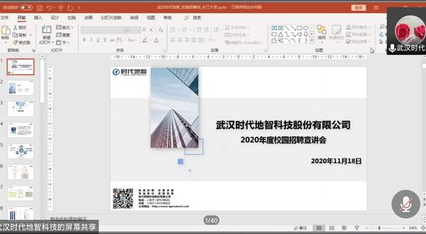 随后武汉时代地智科技股份有限公司、武汉地大华睿地学技术有限公司负责人先后进行了宣讲,也获得了大家的热烈反响,讲解过程中员工们的互动也很积极,使得本次招聘会的氛围很不错,超过了预期的效果。