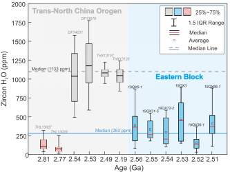 图1. 华北克拉通东部陆块与中部造山带TTG岩石的锆石水含量特征