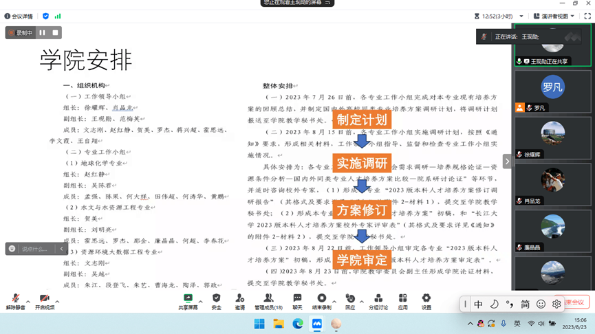 随后,三位系主任依次对地球化学专业、水文与水资源工程专业和资源环境大数据工程专业的人才培养方案修订的基本情况进行了汇报,主要从前期调研、专业的基本情况、培养方案修订过程、培养目标、毕业要求及指标点分解、课程体系、存在的问题等方面进行阐述。而后,教学指导委员会对各专业的调研报告和人才培养方案等材料进行了质询,并最终形成审定意见。