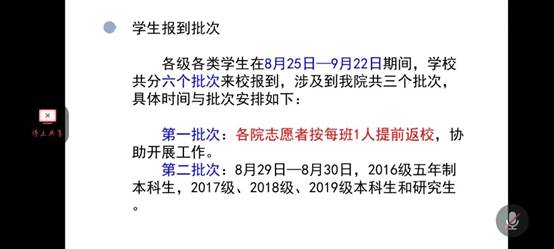 会议过程中向同学们明确了开学时间、开学准备等事项。关于报道,希望同学们可以根据自己的情况在对应的时间返校报道,不要提早到达公司或者无故晚到公司。同时到校后,配合工作人员的工作,进行相应的体温检测、行李消毒等工作。争取做到井然有序,忙而不乱。